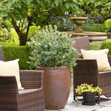 We suggest planting most of our bushes and trees in the ground for the best growth. But for plants that grow well in pots, like dwarf citrus trees, Japanese Maples, rose bushes and trees, and houseplants, up-pot to a planter no more than twice the size of the current nursery pot. We recommend a plant container size around 5 gallons. This means the container you pick will be around 10 to 12 inches tall and wide. For Drift Roses, you could use a hanging basket around 14 inches wide.
